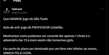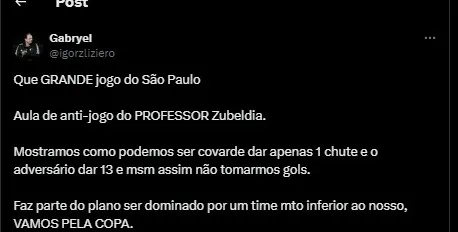 Além disso, outro torcedor criticou a postura do São Paulo fora de casa desde a chegada do técnico. Confira a seguir, a reação da torcida do Tricolor a postura da equipe de Zubeldía na Copa Libertadores da América 2024.
