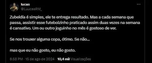 Zubeldía é simples, ele te entrega resultado. Mas a cada semana que passa, assistir esse futebolzinho praticado assim duas vezes na semana é cansativo. Um ou outro joguinho no mês é gostoso de ver.Se nos trouxer alguma copa, ótimo. Se não…mas que eu não gosto, eu não gosto.