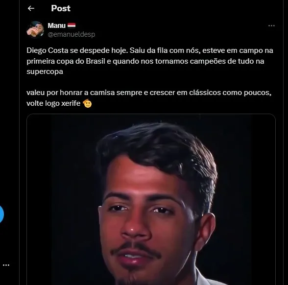 Diego Costa se despede hoje. Saiu da fila com nós, esteve em campo na primeira copa do Brasil e quando nos tornamos campeões de tudo na supercopa