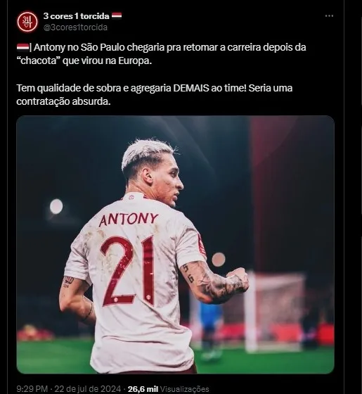 Nas últimas horas o nome de Anthony foi vinculado ao São Paulo, o atacante não vive um bom momento no Manchester United. Além disso, o atacante repostou um vídeo do primeiro gol com a camisa do time Paulista.