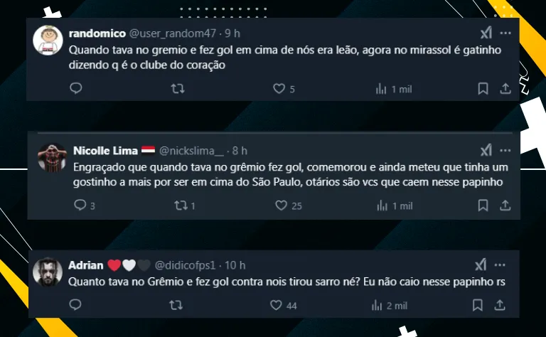 Por fim, apesar da identificação e das palavras sinceras do lateral, alguns são-paulinos relembraram o fato de Reinaldo ter provocado o SPFC em 2023, quando marcou no Tricolor vestindo a camisa do Grêmio: