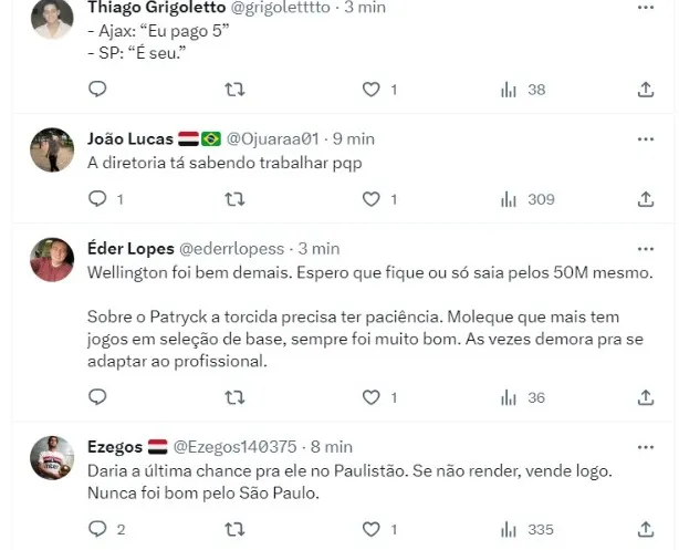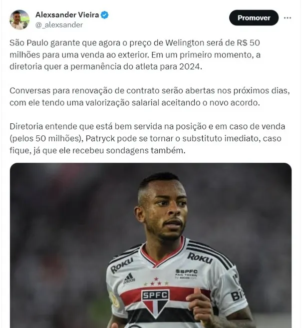 Além disso, tanto o entorno do jogador, quanto o clube colorado querem permanência para 2024. A diretoria do São Paulo também quer a permanência de Welington, apesar das sondagens da Europa. Dessa forma, a diretoria entende em um primeiro momento que não deve reforçar o seu lado esquerdo. Conversas para renovação de contrato três temporadas serão abertas nos próximos dias, com ele tendo uma valorização salarial aceitando o novo acordo.