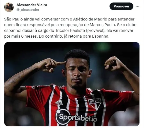 De acordo com apurações do Bolavip Brasil, o São Paulo ainda vai conversar com o Atlético de Madrid, dono dos direitos do jogador para entender quem ficará responsável pela recuperação de Marcos Paulo, que deve ter um tempo de recuperado entre seis até oito meses todo.