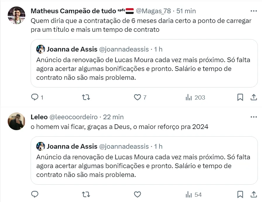 Com contrato se encerrando em dezembro, as partes conversam há bastante tempo e, de acordo com a jornalista Joanna de Assis, o anúncio da renovação de contrato de Lucas Moura com o São Paulo está perto de acontecer.