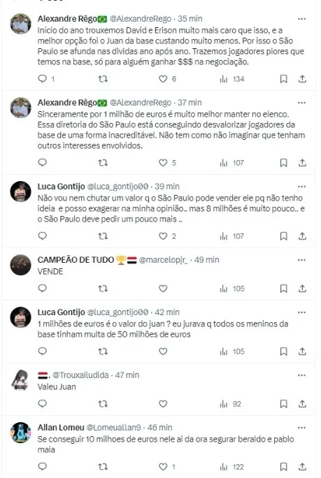 Nessa linha, dentre os que podem ser negociados, está Juan. De acordo com o portal Avante Meu Tricolor, o Tricolor e o estafe do atacante receberam uma sondagem do Ajax, da Holanda, mas o negócio ainda está em seu começo.