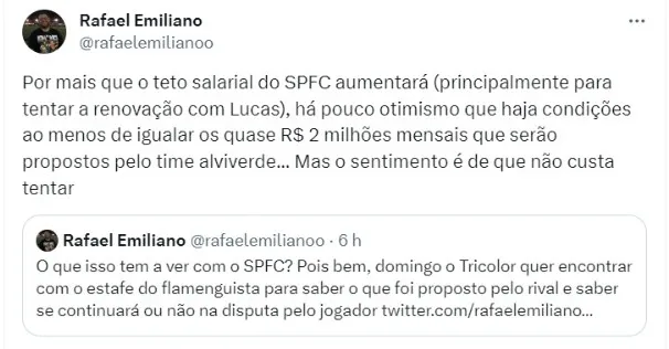 “O que isso tem a ver com o SPFC? Pois bem, domingo o Tricolor quer encontrar com o estafe do flamenguista para saber o que foi proposto pelo rival e saber se continuará ou não na disputa pelo jogador”, iniciou escrevendo Rafael Emiliano, em sua conta oficial no X (antigo Twitter), antes de prosseguir: