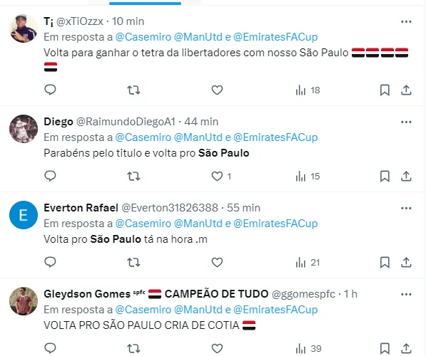 Neste sábado (25), nas redes sociais, após o título do Manchester United, os Tricolores aproveitaram para parabenizar o volante, pedindo a volta dele para o São Paulo. Confira os comentários logo abaixo.