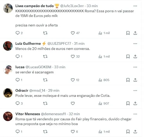 Segundo o comunicador, a Roma tem interesse na contração de William Gomes de 17 anos, atacante revelado e destaque da base do São Paulo, que tem treinado entre os profissionais.