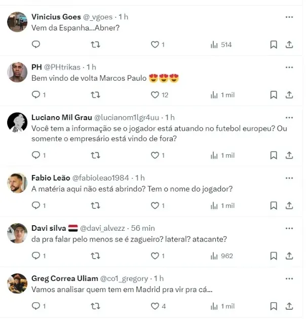 “Há uma expectativa acerca desta reunião que se confirmado positiva, pode resultar em definição para reforçar o São Paulo nesta janela. O agente vem de Madrid para SP”, concluiu a matéria compartilhada no X (antigo Twitter).