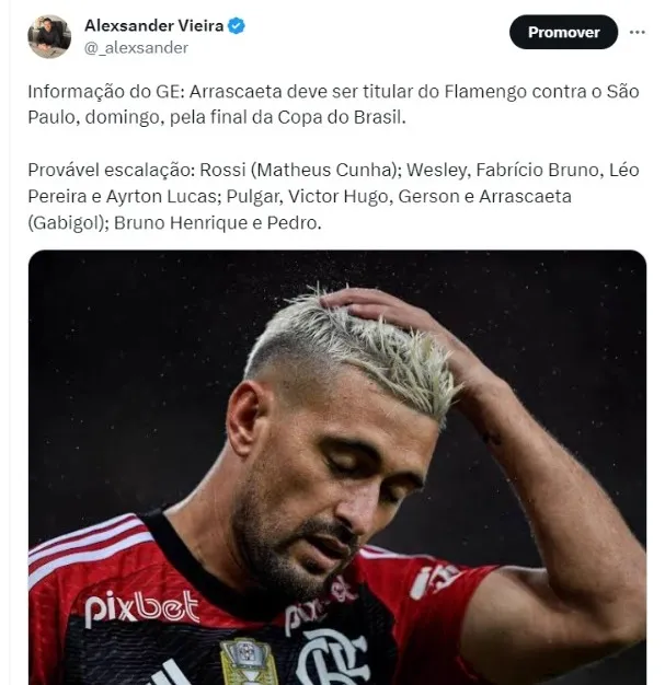 De acordo com o GE, Arrascaeta deve ser titular do Flamengo contra o São Paulo, domingo, pela final da Copa do Brasil. Provável escalação: Rossi (Matheus Cunha); Wesley, Fabrício Bruno, Léo Pereira e Ayrton Lucas; Pulgar, Victor Hugo, Gerson e Arrascaeta (Gabigol); Bruno Henrique e Pedro.