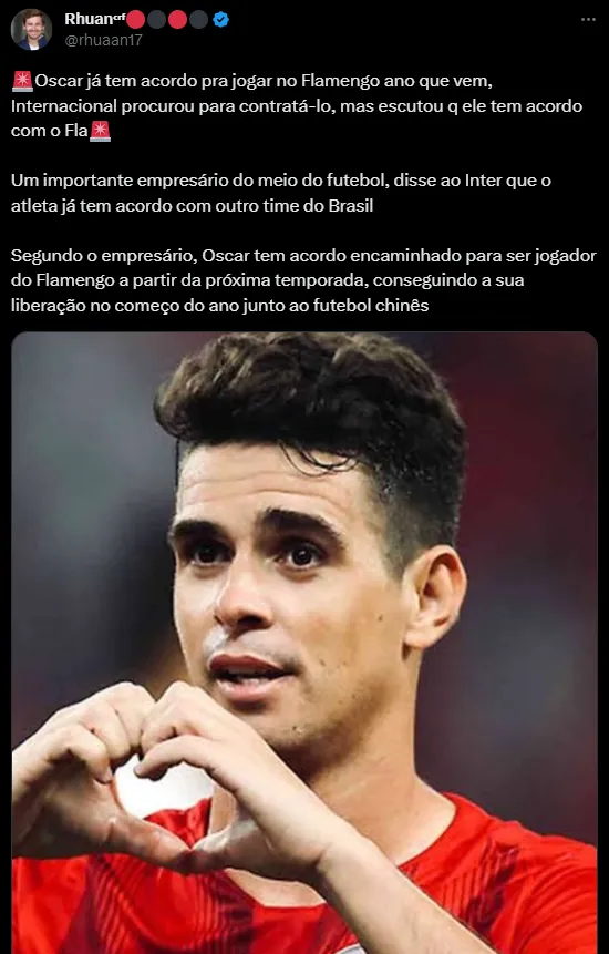 De acordo com informações de um importante empresário do meio do futebol, Oscar tem um acordo encaminhado para retornar ao Brasil como jogador do Flamengo na próxima temporada, buscando sua liberação junto ao futebol chinês no início do ano. Embora o São Paulo ainda não tenha oficializado nenhuma tentativa de repatriar Oscar, ele permanece no radar do clube. No entanto, parece que o destino do atleta aponta para o Flamengo.