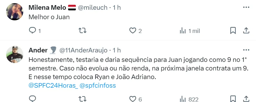 Caso não consiga a contratação de um camisa 9, uma alternativa para Carpini pode ser o jovem Juan, que tem contrato até o fim de 2024 e a diretoria já trabalha para renovar com o atacante.