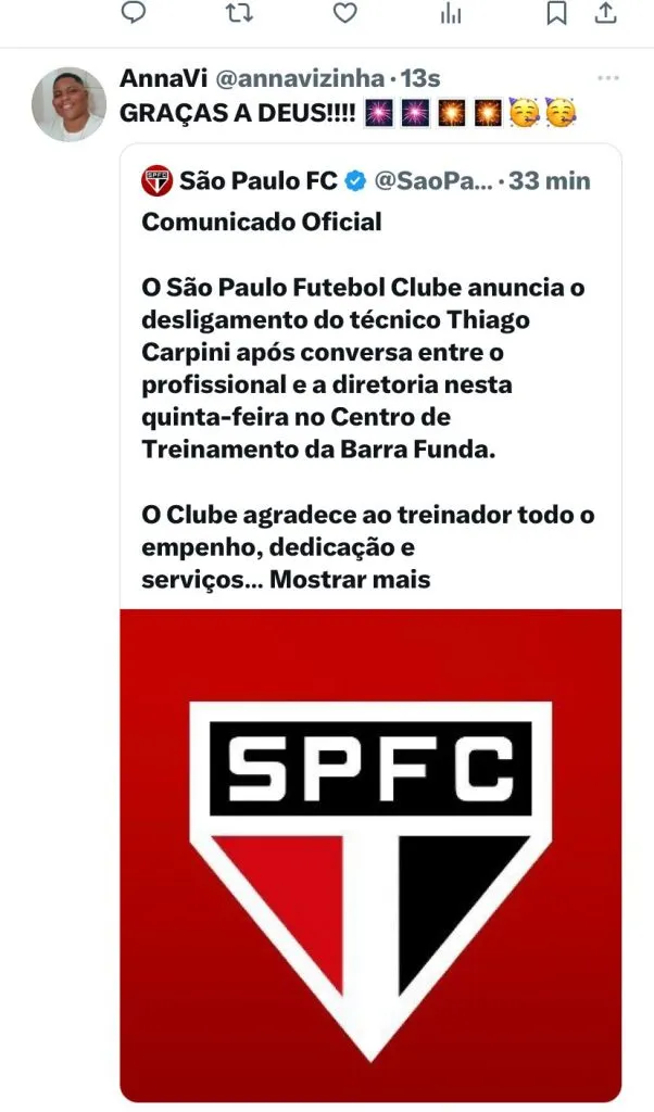 O que culminou na demissão do treinador foi a derrota nesta quarta-feira (17), para o Flamengo por 2 a 1. Em nota, o Tricolor informou a saída do técnico: “Comunicado Oficial O São Paulo Futebol Clube anuncia o desligamento do técnico Thiago Carpini após conversa entre o profissional e a diretoria nesta quinta-feira no Centro de Treinamento da Barra Funda”, iniciou.
