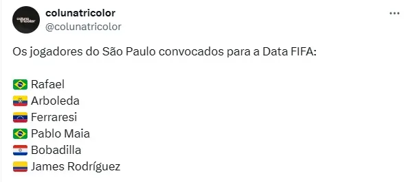 Arboleda e Ferraresi, zagueiros do São Paulo, foram convocados para defenderem a Seleção do Equador e Venezuela, respectivamente. Bobadilla foi convocado pela Seleção do Paraguai.