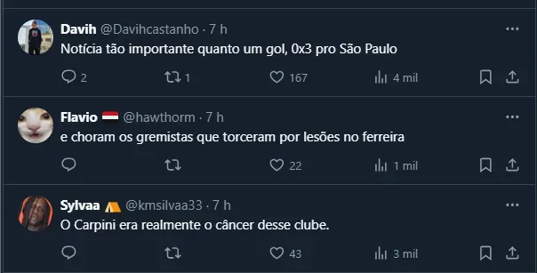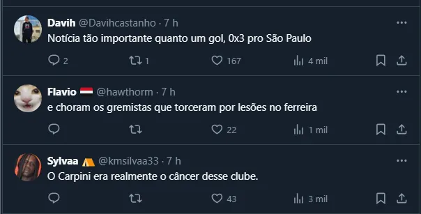 Vale lembrar que, contratado junto ao Grêmio na virada de ano, Ferreirinha vinha oscilando entre a titularidade e a reserva com Carpini. Até por isso, ao continuar sua avaliação sobre o novo comandante, ele colocou o ex-técnico na conversa: