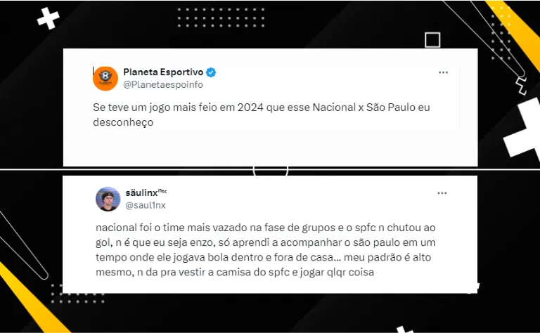 Na mesma pegada, @saul1nx, comentou também sobre a partida, “nacional foi o time mais vazado na fase de grupos e o spfc n chutou ao gol, n é que eu seja enzo, só aprendi a acompanhar o são paulo em um tempo onde ele jogava bola dentro e fora de casa… meu padrão é alto mesmo, n da pra vestir a camisa do spfc e jogar qlqr coisa”