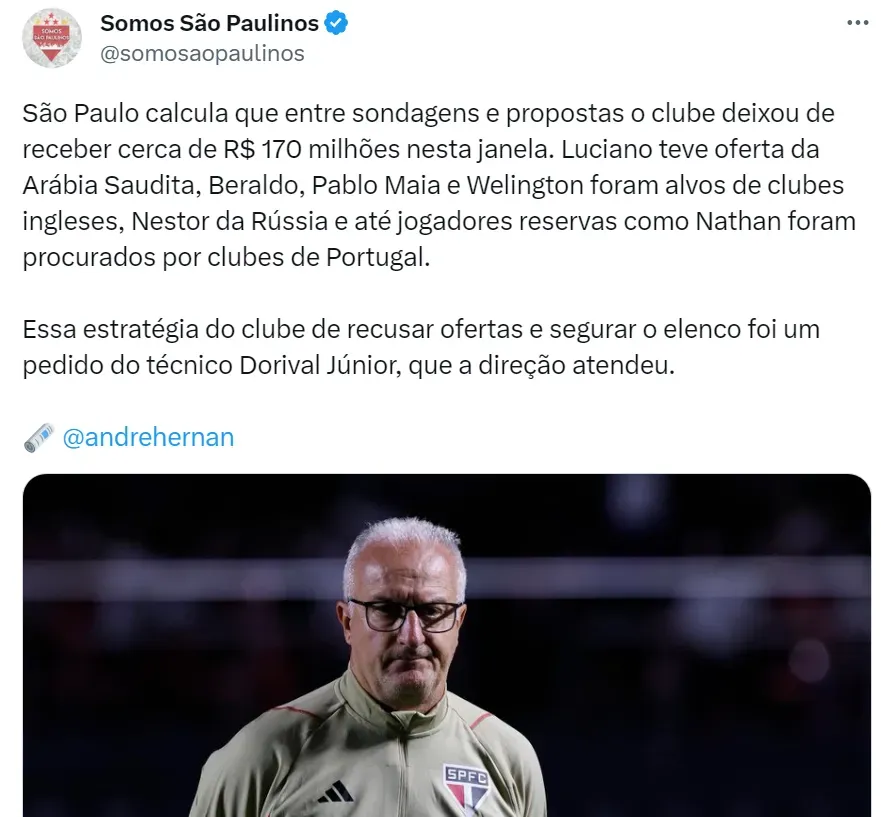 De acordo com André Hernan, colunista do UOL Esporte, o São Paulo optou por manter o seu elenco e atendeu um pedido do treinador Dorival Júnior, que não queria perder ninguém no meio da temporada. Com isso, a diretoria recusou ofertas por vários nomes na janela de transferências. A estimativa é que o Clube do Morumbi deixou de arrecadar quase R$ 170 milhões em vendas.