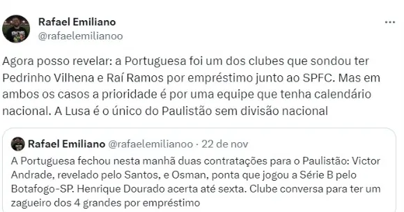 Segundo o jornalista Rafael Emiliano, a Portuguesa foi um dos clubes que sondou ter Pedrinho Vilhena e Raí Ramos por empréstimo junto ao SPFC.