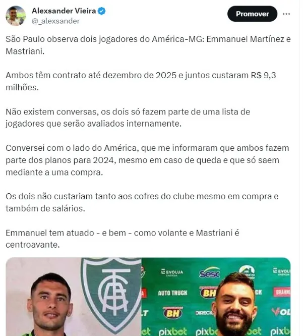 Ambos têm contrato até dezembro de 2025 e juntos custaram R$ 9,3 milhões. Não existem conversas, os dois só fazem parte de uma lista de jogadores que serão avaliados internamente. Conversamos com o lado do América, que me informaram que ambos fazem parte dos planos para 2024, mesmo em caso de queda e que só saem mediante a uma compra.