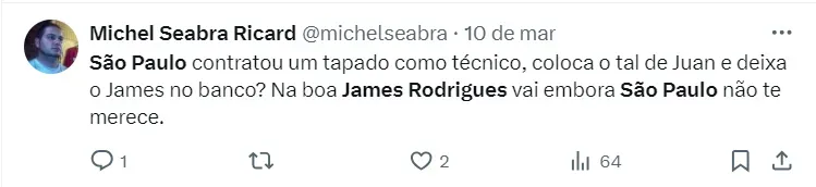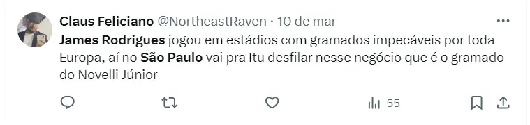 “O São Paulo precisa definir como joga, quem joga, quais os titulares na maioria dos casos, sem contar com James Rodríguez. O camisa 55 pode ajudar, muito até, em momentos, mas imaginá-lo titular e com frequência é pura ficção”, escreveu.