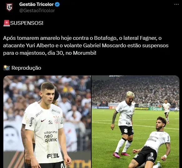 O trio recebeu o terceiro cartão amarelo e não jogará o clássico. Será um confronto decisivo, já que o São Paulo quer se afastar da zona de rebaixamento do Campeonato Brasileiro e inclusive foi ultrapassado pelo Corinthians após a vitória do rival sobre o Botafogo, por 1 a 0, em casa. Nesse momento, O Tricolor é o 14º colocado, com 28 pontos, enquanto o Corinthians é o 10º, com 30.