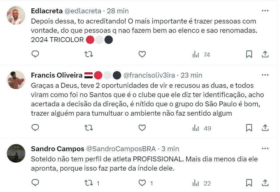 Ainda segundo o repórter André Hernan, pessoas importantes do Clube do Morumbi entendem que o perfil do Soteldo dentro e fora do campo não se encaixa com o atual elenco do São Paulo.