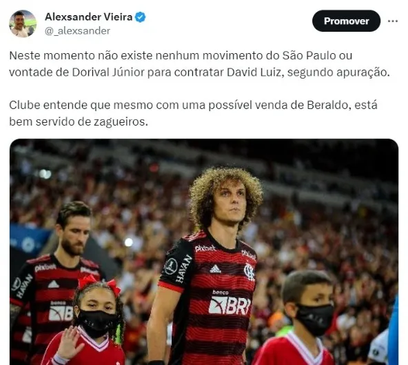Segundo apurou a nossa reportagem, no momento não existe nenhum movimento do São Paulo ou vontade de Dorival Júnior para contratar David Luiz.