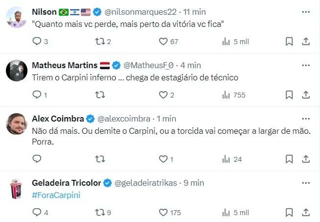 Nas redes sociais, os torcedores pedem a demissão do técnico Thiago Carpini