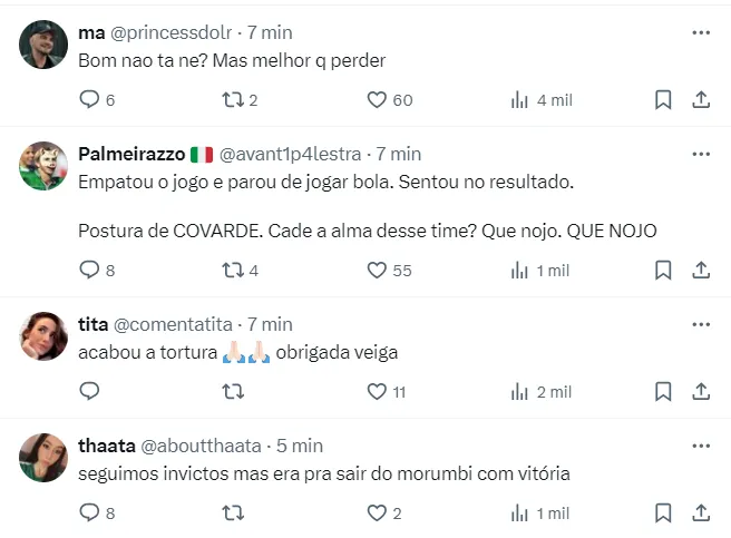 Nas redes sociais, os torcedores do Verdão se conformam com o empate no Morumbis.