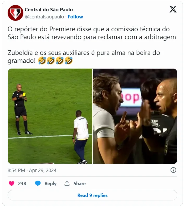 São Paulo e Palmeiras se enfrentaram nesta segunda-feira (29), pela quarta rodada do Campeonato Brasileiro. Um lance curioso da comissão técnica comandada por Luis Zubeldía chamou a atenção: um revezamento de reclamações entre todos os membros.