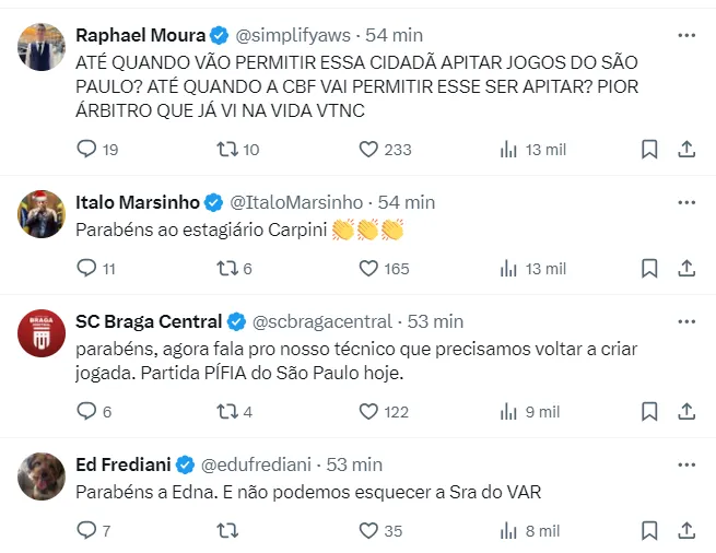 Até que Welington achou um cruzamento rasteiro para o atacante Erick, que só teve o trabalho de empurrar para as redes. Mas, após a chamada do VAR, Edina analisou o lance e deu um toque de mão do jogador são-paulino antes do chute ao gol.