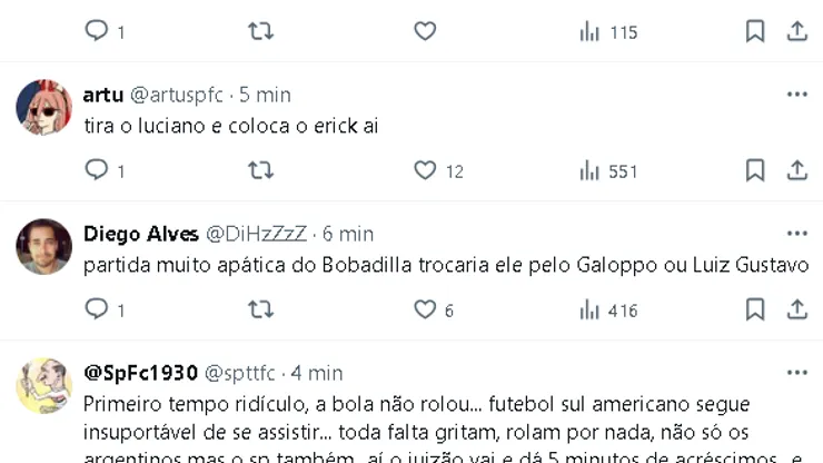 O São Paulo conta com os seguintes jogadores no banco de reservas: Jandrei, Diego Costa, Galoppo, Calleri, Michel Araújo, Luiz Gustavo, André Silva, Moreira, Ferraresi, Erick, Patryck e Ferreira.