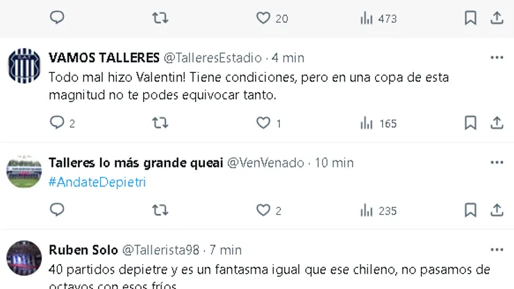O Talleres conta com os seguintes jogadores no banco de reservas: Morales, Riveros, Segovia, Ruíz Rodríguez, Martínez, Sequeira, Vigo, Catalán, Albarracín, Galarza, Botta e Bustos.