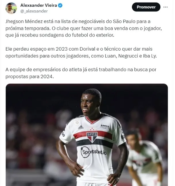 Jhegson Méndez está na lista de negociáveis do São Paulo para a próxima temporada. O clube quer fazer uma boa venda com o jogador, que já recebeu sondagens do futebol do exterior. Ele perdeu espaço em 2023 com Dorival e o técnico quer dar mais oportunidades para outros jogadores, como Luan, Negrucci e Iba Ly.