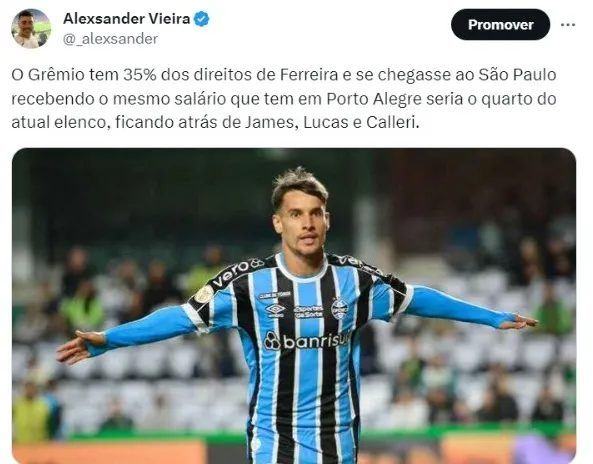 O Grêmio tem 35% dos direitos de Ferreira e se chegasse ao São Paulo recebendo o mesmo salário que tem em Porto Alegre seria o quarto do atual elenco, (R$ 600 mil) ficando atrás de James, Lucas e Calleri.