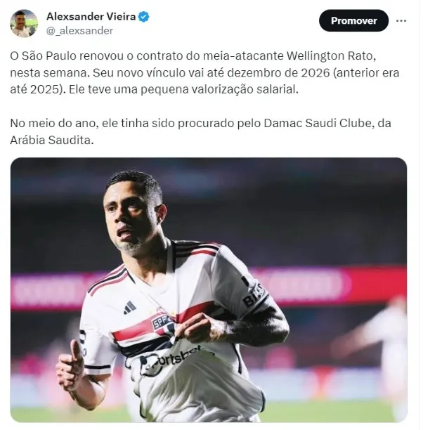 Segundo apurou a nossa reportagem, o São Paulo renovou o contrato do meia-atacante Wellington Rato, nesta semana, mas o anúncio ainda será feito pelas redes sociais do clube.