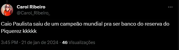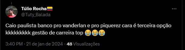 “Caio Paulista saiu de um campeão mundial pra ser banco do reserva do Piquerez kkkkk“, “Caio Paulista banco pro Vanderlan e pro Piquerez cara é terceira opção kkkkkkkkk gestão de carreira top“, foram alguns dos comentários.