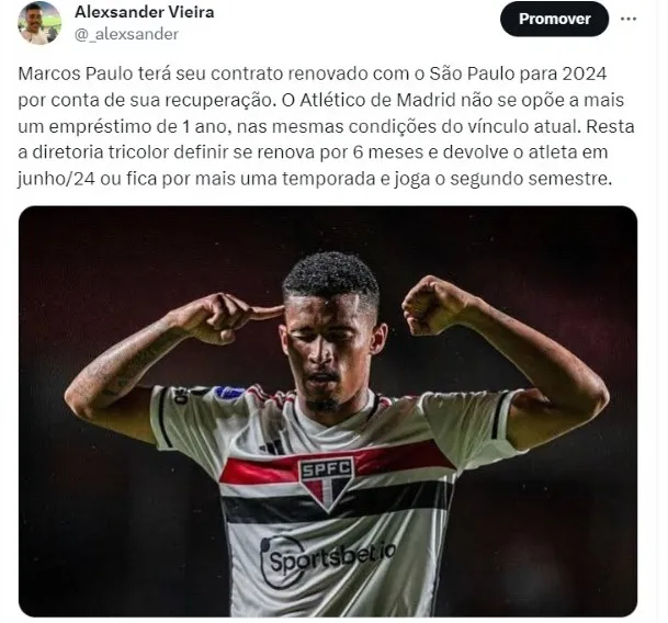 O jogador deverá receber alta hospitalar já nos próximos dias e, então, iniciará o processo de recuperação no REFFIS Plus. Marcos Paulo terá seu contrato renovado com o São Paulo para 2024 por conta de sua recuperação. O Atlético de Madrid não se opõe a mais um empréstimo de 1 ano, nas mesmas condições do vínculo atual.
