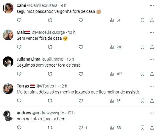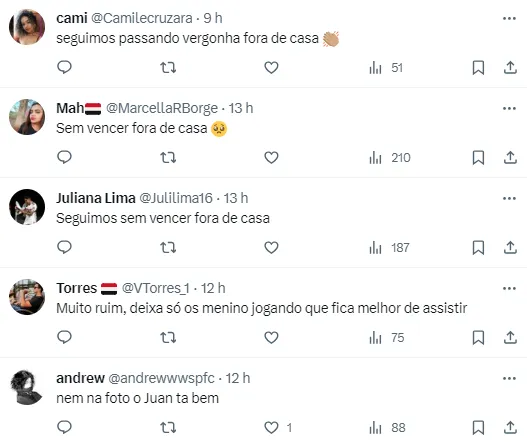 Assim que o Twitter oficial do São Paulo postou sobre o fim do jogo, muitos torcedores foram reclamar do time, que não ganha e perde muitas oportunidades de gols durante os 90 minutos. “Seguimos sem ganhar fora de casa, né?”, uma torcedora comentou.
