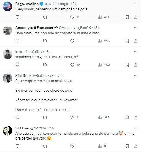 Outro torcedor comentou: “Seguimos”, perdendo um caminhão de gols. E um outro foi mais enfático sobre os gols perdidos e a disputa da supercopa: “Supercopa é em campo neutro, viu. E o rival vem de novo cheio de ódio. Vão fazer o que pra evitar um vexame? Dorival não engana mais ninguém.”