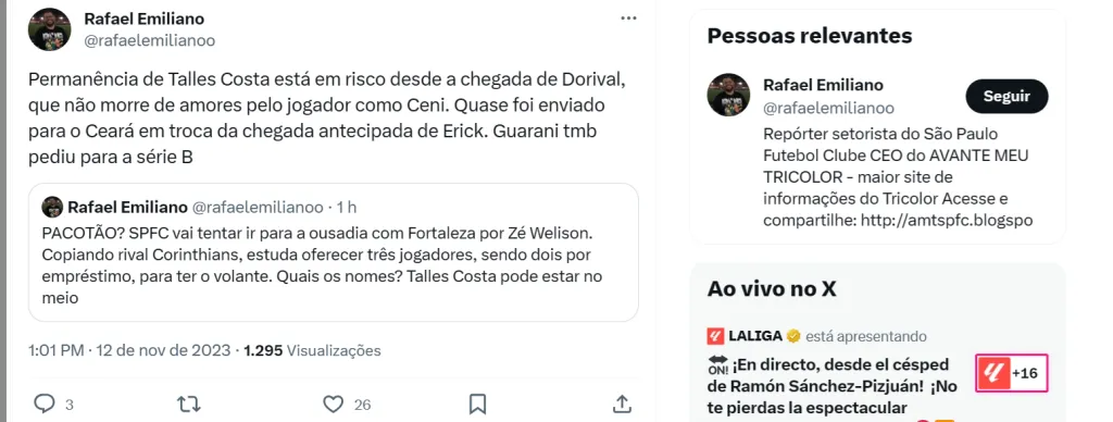 Ao mesmo tempo, o presidente Julio Casares e o diretor de futebol Carlos Belmonte vão pesquisando nomes interessantes para reforçar o plantel. Gustavo Scarpa já foi descartado, informou o setorista Alexsander Vieira, do Bolavip Brasil.