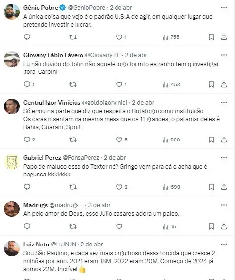 Vale lembrar que o norte-americano não apresentou provas até o momento e já foi acionado pelo STJD, podendo levar um gancho pesado. O São Paulo por sua vez, interpelou criminalmente o empresário na Justiça, pedindo que ele aponte quais atletas do Clube teriam participado da fraude, afinal, Textor declarou a participação de cinco jogadores.