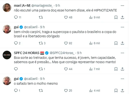 Inclusive, Carpini já chegou em seu novo clube. Em vídeo publicado pelo perfil oficial do São Paulo, nas redes sociais, o treinador se mostrou empolgado com o novo desafio e acabou valorizando a história da equipe.