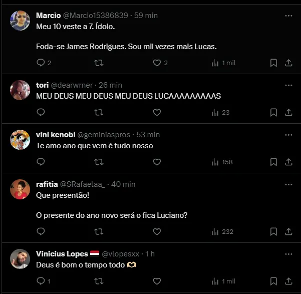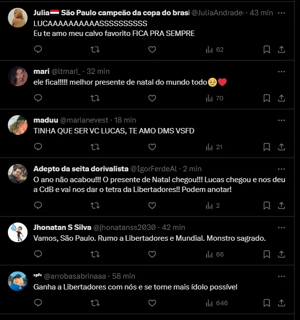 “Maior reforço, o Lucas ficou“, disse um animado torcedor. Outros vão além, agradecem a Larissa, esposa do atacante, pela permanência do jogador, em um tom bem-humorado: “Larissa muito ídola da torcida tricolor“.