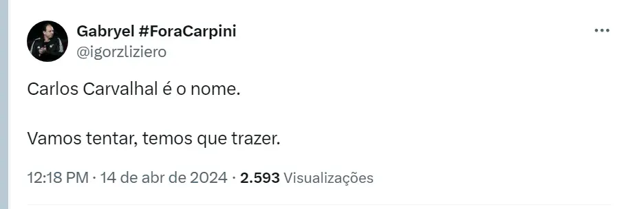 Isso foi o suficiente para agitar a torcida do São Paulo, que deseja a demissão de Thiago Carpini. No X (antigo Twitter), os torcedores acreditam que Carlos Carvalhal seja o nome ideal para assumir o comando da equipe.