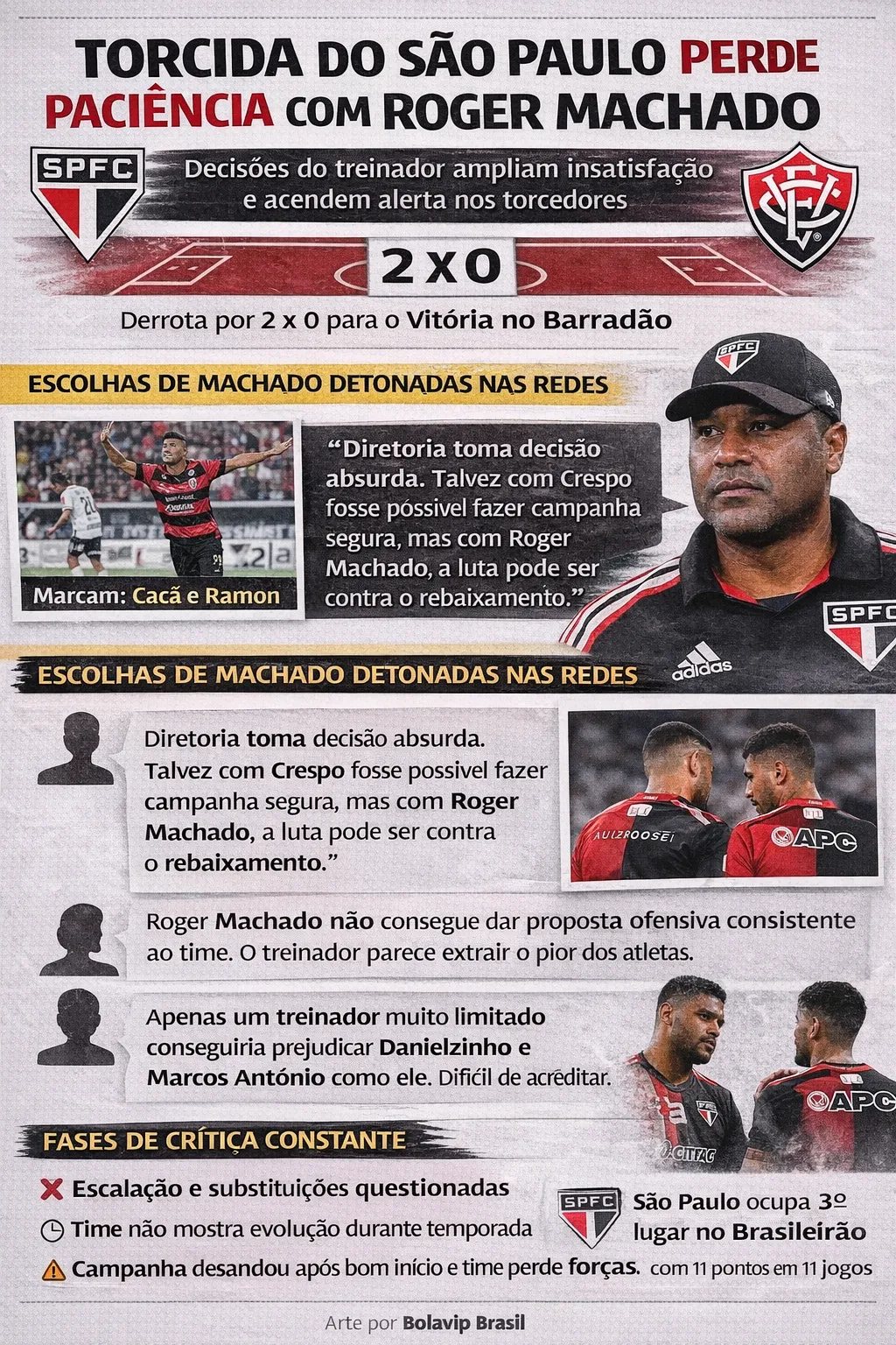“O pior jogo do São Paulo sob o comando de Roger Machado parece ser sempre o próximo. O mais preocupante é a queda de rendimento de jogadores que antes se destacavam, como Lucas Ramon, Danielzinho e Marcos Antônio. O treinador parece extrair o pior dos atletas. Se ele não sair, quem corre risco é o próprio clube”, destacou mais um torcedor sobre o trabalho de Roger Machado.