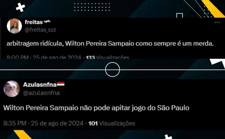 Revoltado, um torcedor tricolor fez duras críticas a Wilton Pereira Sampaio no X, antigo Twitter: “Wilton Pereira Sampaio, em jornada abjeta, destruiu o jogo no MorumBIS. É uma necessidade de tentar ser o protagonista do espetáculo. Coisa ridícula e incoerente. Ele era um bom árbitro. Que pena”.
