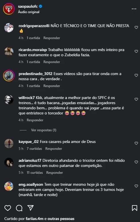 Logo após a derrota no Rio, torcedores do São Paulo tomaram as redes sociais para protestar contra a diretoria e ironizar os treinos da equipe. Nos comentários da postagem oficial do clube sobre a reapresentação do elenco neste domingo (13), não faltaram críticas à gestão de Julio Casares e ao desempenho técnico do time.