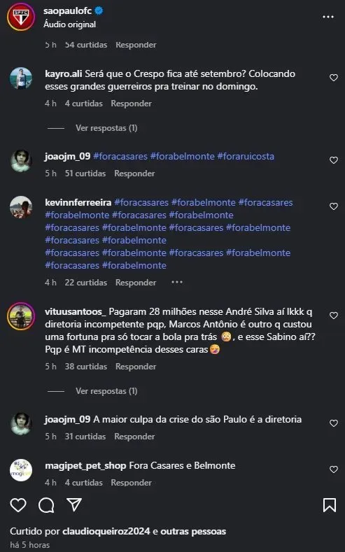 “Fora Casares, fora diretoria! Treino pra quê, se não dá resultado? Vai ter que treinar todo dia agora!”, escreveu um torcedor. Outros foram além, clamando por mudanças radicais: “Precisamos de um SUPER PRESIDENTE, um SUPER DIRETOR DE FUTEBOL!”