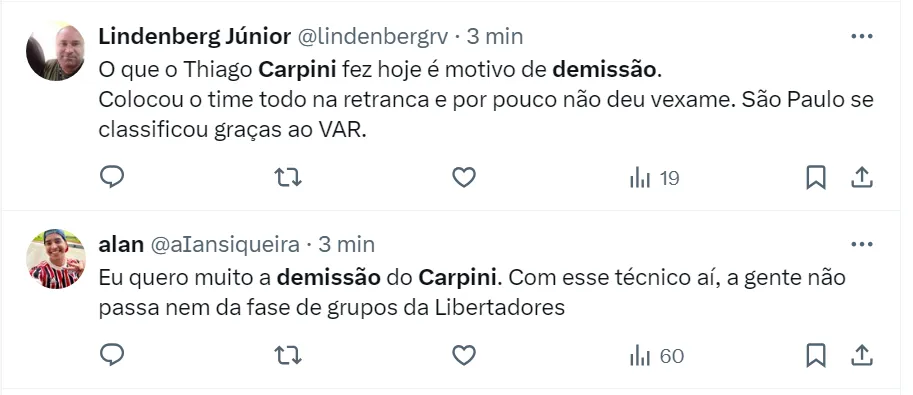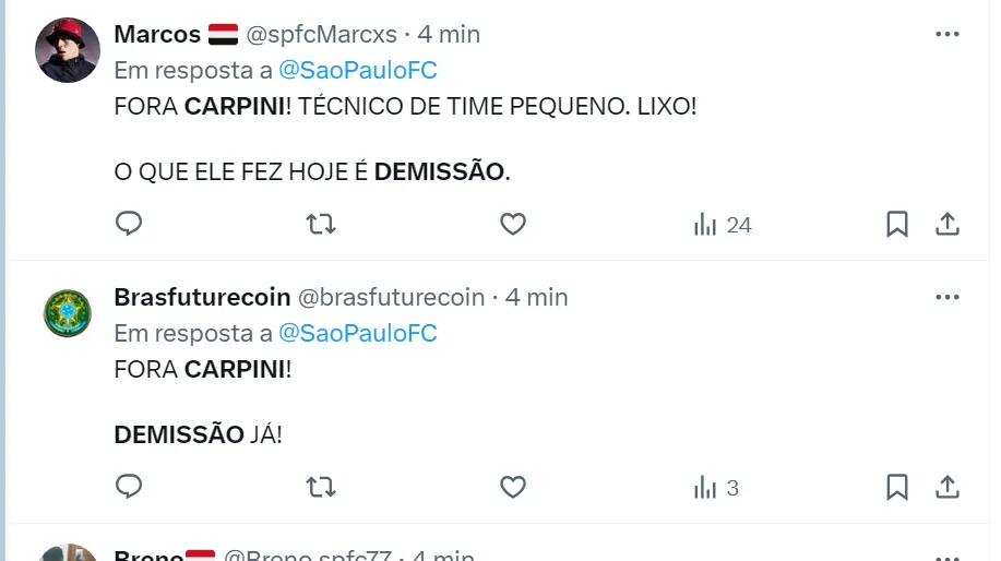 Apesar de estar classificado, a torcida está na bronca com Carpini e pede a demissão do treinador no X (antigo Twitter). Muitos são-paulinos entendem que ele não tem capacidade para comandar o Clube do Morumbi.